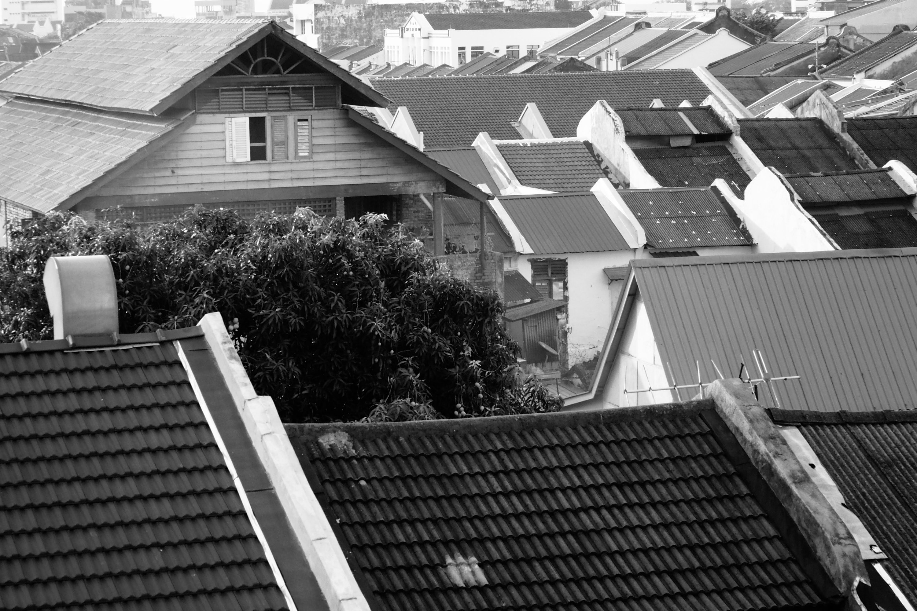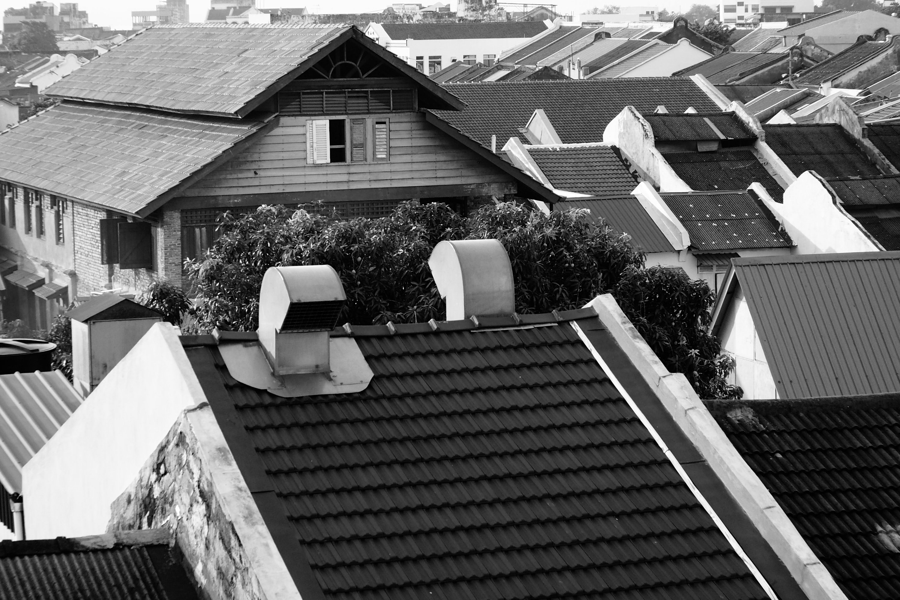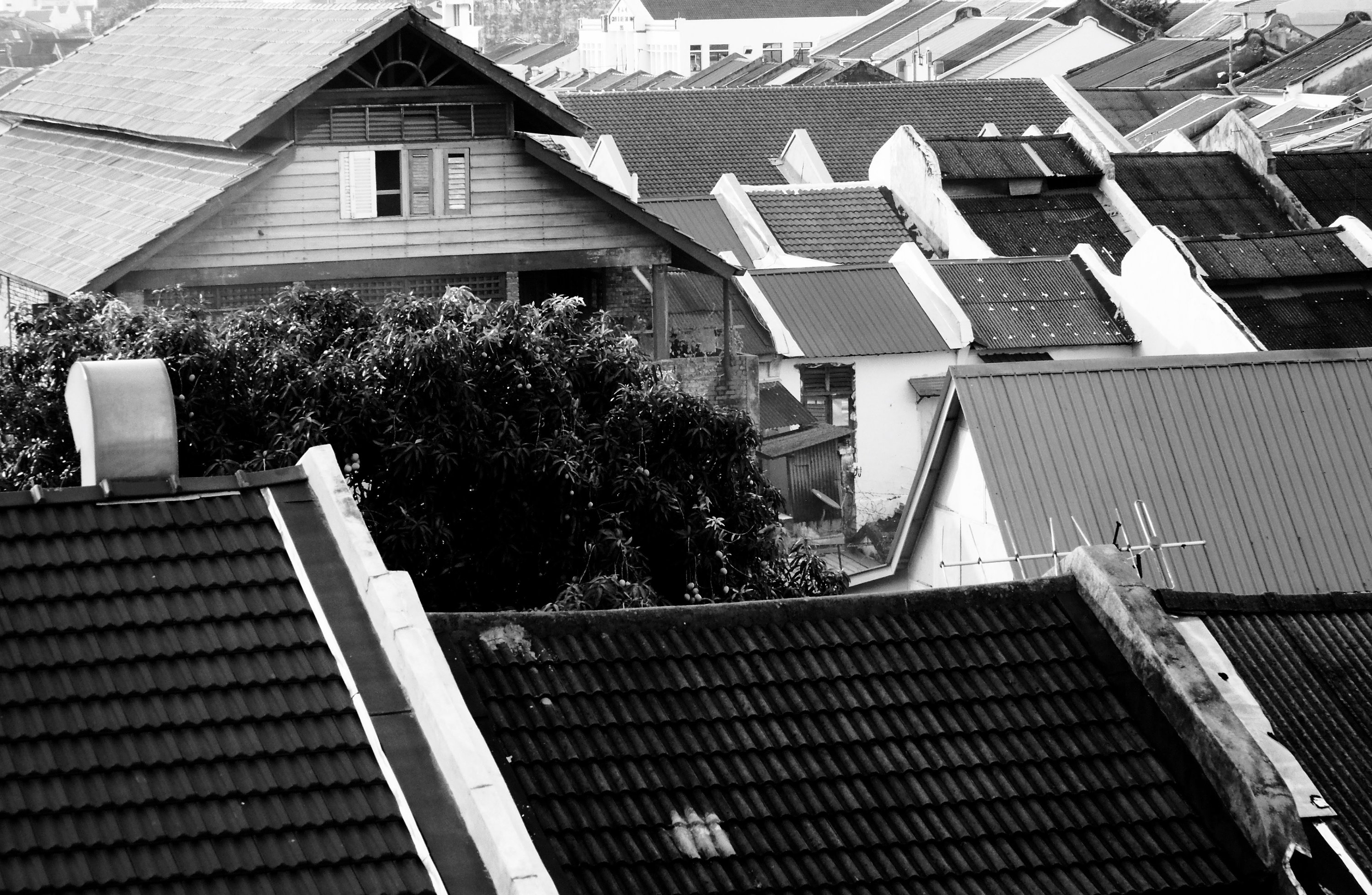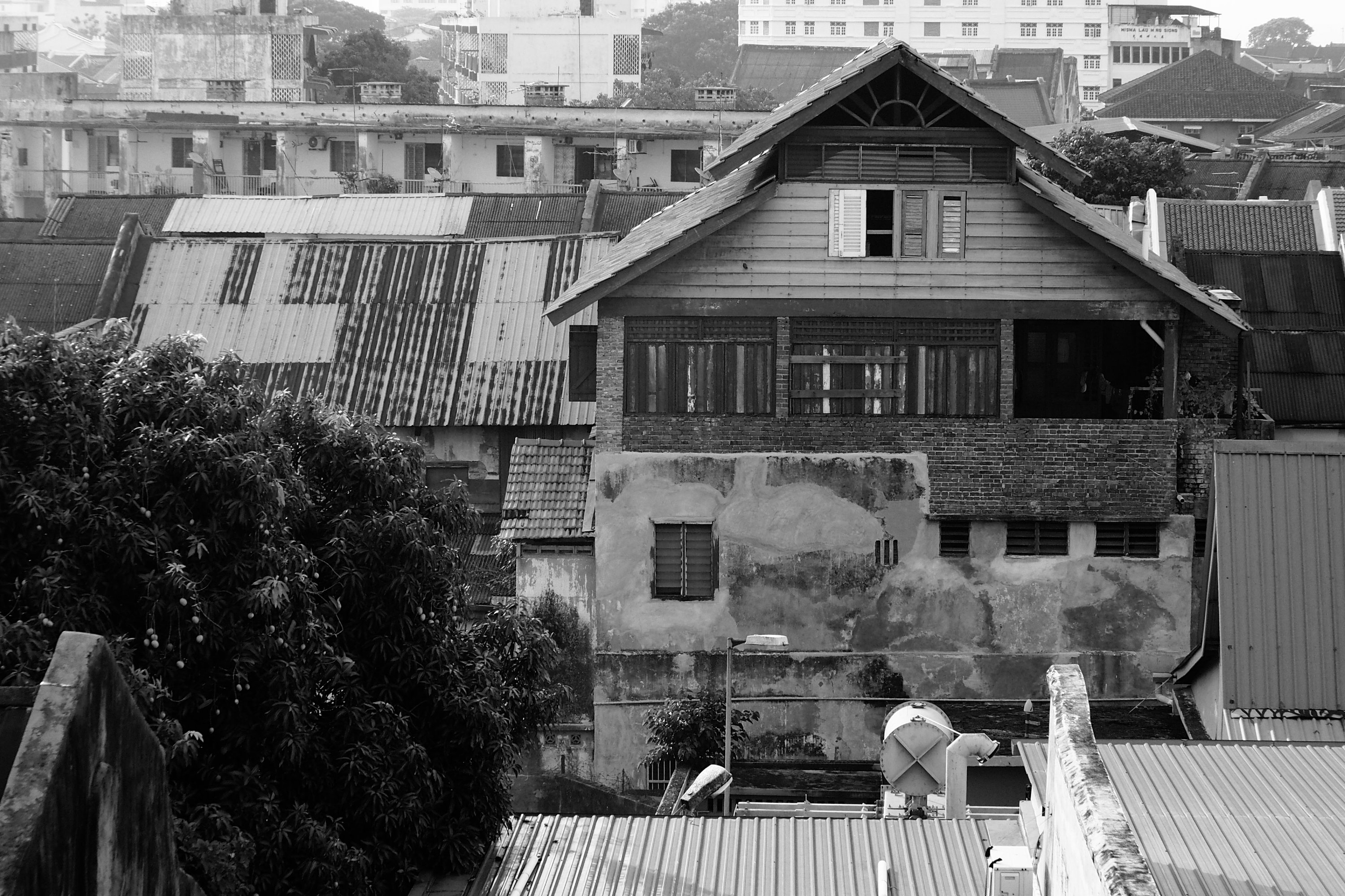 Chowrasta Market n view from 3rd floor of roof tops as well as people on the streets.